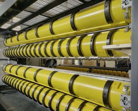Complete servo control, Cylinder Type Shaft Low Inertia Force, Fast Start and Stop, High speed cutting even in short length cardboard, Oil cooling system