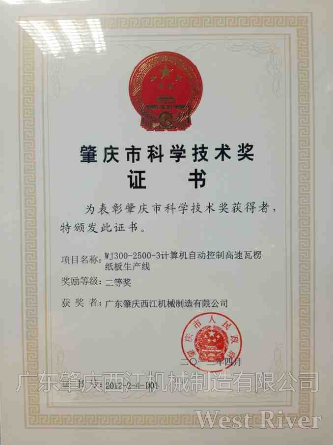 我司“WJ300-2500-3計(jì)算機(jī)自動(dòng)控制高速瓦楞紙板生產(chǎn)線”獲得2012年度肇慶市科學(xué)技術(shù)獎(jiǎng)