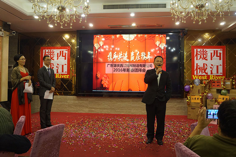 2016年1月30日下午,廣東肇慶西江機(jī)械制造有限公司2016年新春團(tuán)拜會(huì)在肇慶金鼎大酒店舉辦。參加團(tuán)拜會(huì)的有公司領(lǐng)導(dǎo)、全體員工以及我們戰(zhàn)略合作伙伴與特繳嘉賓,二百多人歡聚一堂。